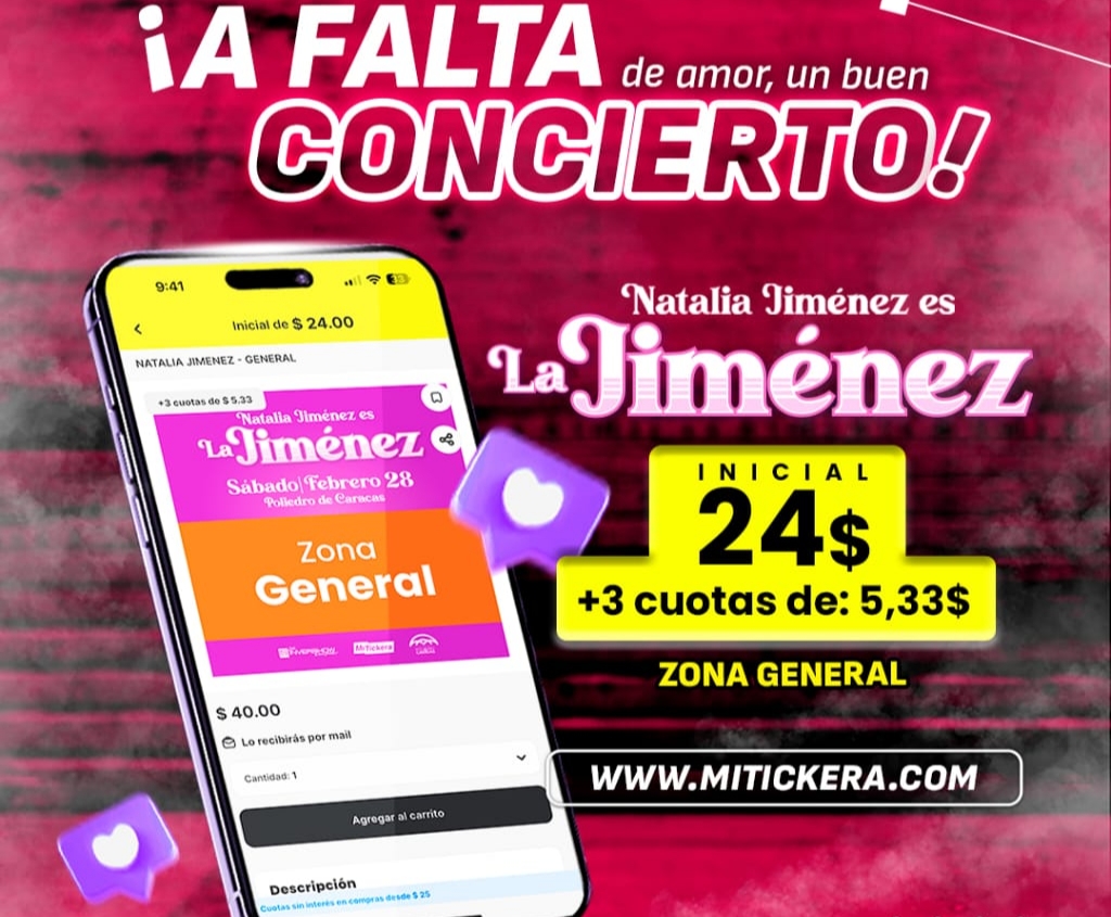 Las entradas para este concierto van desde los 40 dólares o al cambio en bolivares calculados a tasa BCV, y pueden ser adquiridas por Cashea pagando una inicial y el resto en cómodas cuotas sin intereses. Tambíen puedes conseguir tus boletos a través de www.mitickera.com, en Metropark de Chacaito y en el restaurante Cami Deli ubicado en los Palos Grandes.