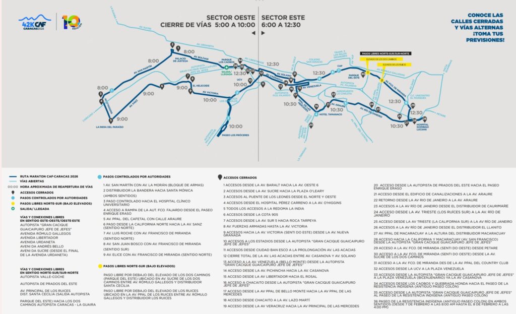 El domingo 8 de febrero el Parque Sucre Los Caobos, punto de salida de la carrera, contará con acceso libre para todo el público, incluidos los familiares y amigos de corredores, exclusivamente por la Plaza de Los Museos. Por su parte, la entrada por Plaza Venezuela estará reservada para los corredores con número, sin importar la distancia para la que se inscribieron. Este mismo punto servirá de salida para que los corredores de la distancia 10K se ubiquen en su corral.